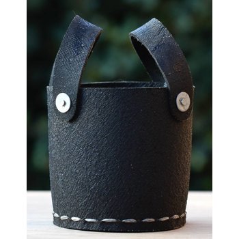 Een rubberen pot van zwarte gerecyclede autobanden. De pot heeft twee handvatten. De pot is gemaakt van gebruikte autobanden en dat kun je wel zien.
